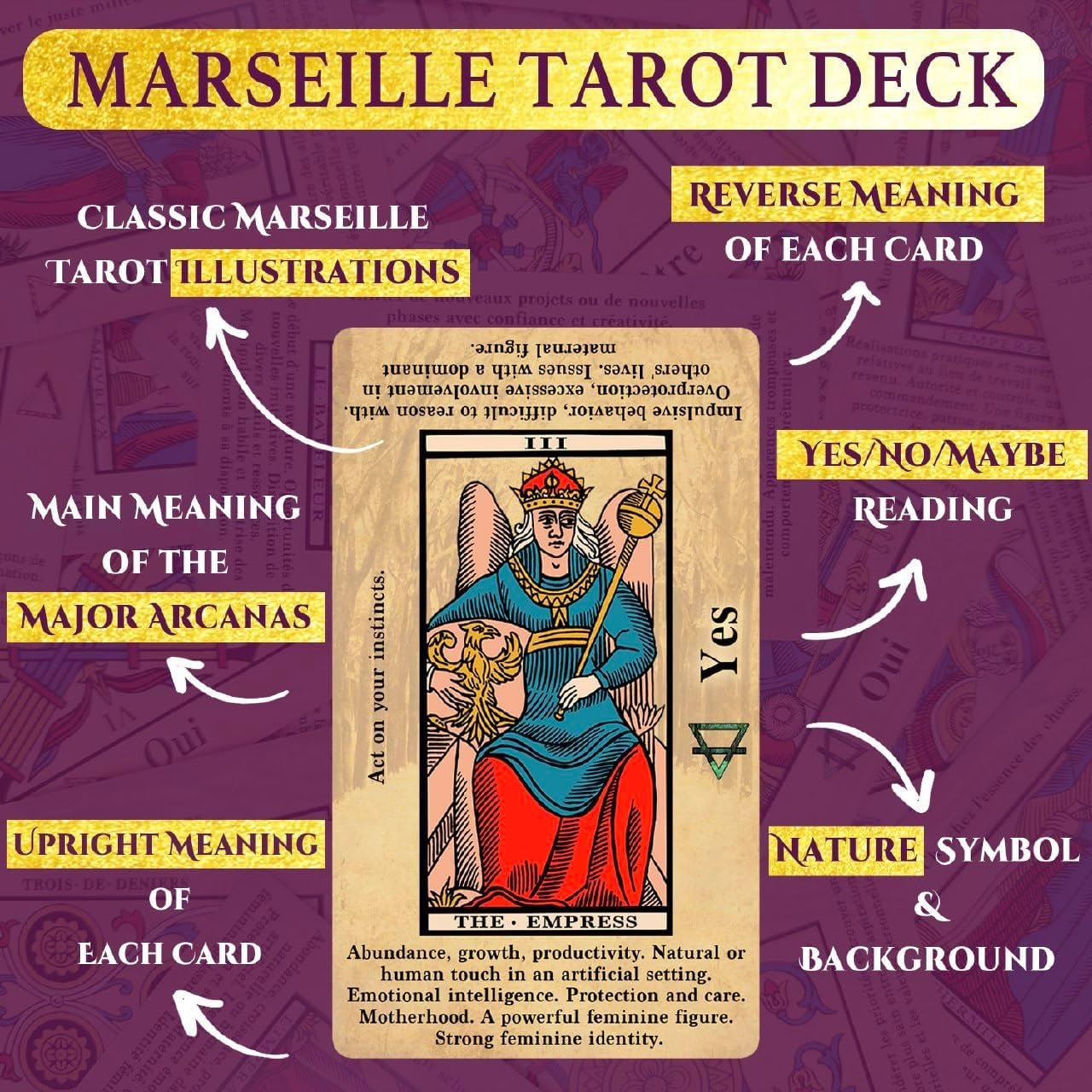 - Authentic Marseille Tarot Artwork: Experience the timeless beauty of the Marseille Tarot deck, known for its historical significance and unique art style. Each card faithfully reproduces the original designs, offering an authentic tarot reading experience in English.