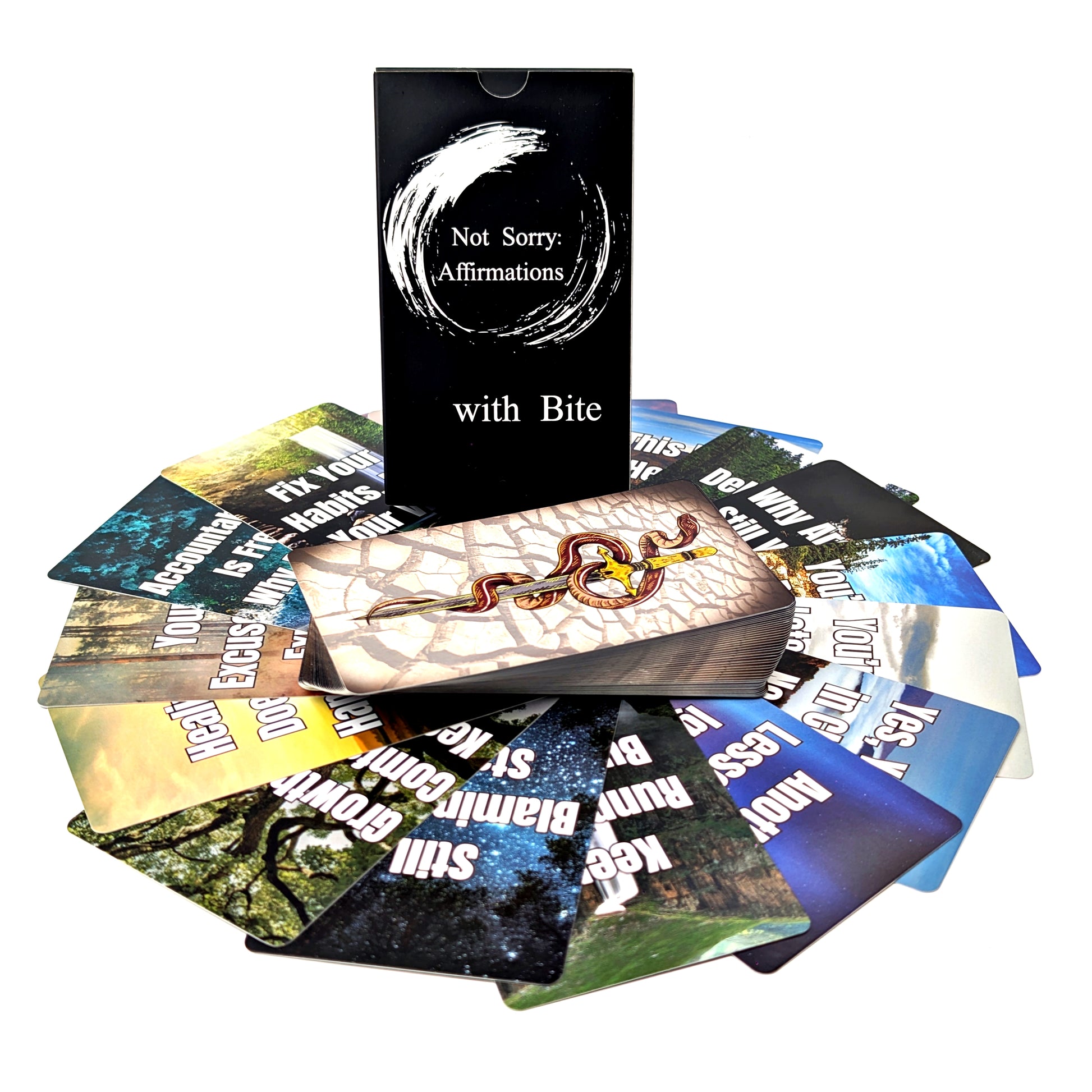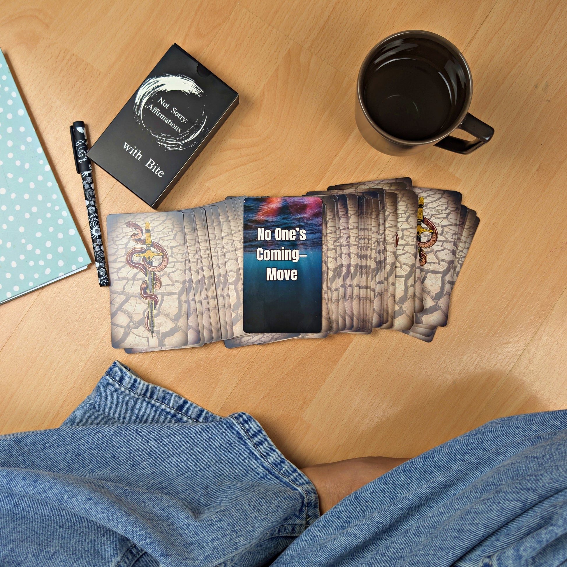 Introducing 'Not Sorry: Affirmations with Bite' by Witchy Cauldron - a deck of 60 cards that cuts through the fluff of traditional motivation. These aren't your typical gentle affirmation cards; they're direct, honest, and refreshingly blunt reality checks for when you're stuck in procrastination mode. Each card delivers a sharp wake-up call, addressing the excuses we tell ourselves when avoiding action. Perfect for your desk, workspace, or anywhere you need a swift kick of truth. Whether you're a chronic procrastinator, a self-sabotaging creative, or someone who's been 'almost ready' to start that project for years, these cards will strip away the comfortable lies and push you toward actual movement. No coddling, no sugar-coating - just straight talk when you need it most. Keep them within reach for those moments when you catch yourself making excuses instead of making progress.